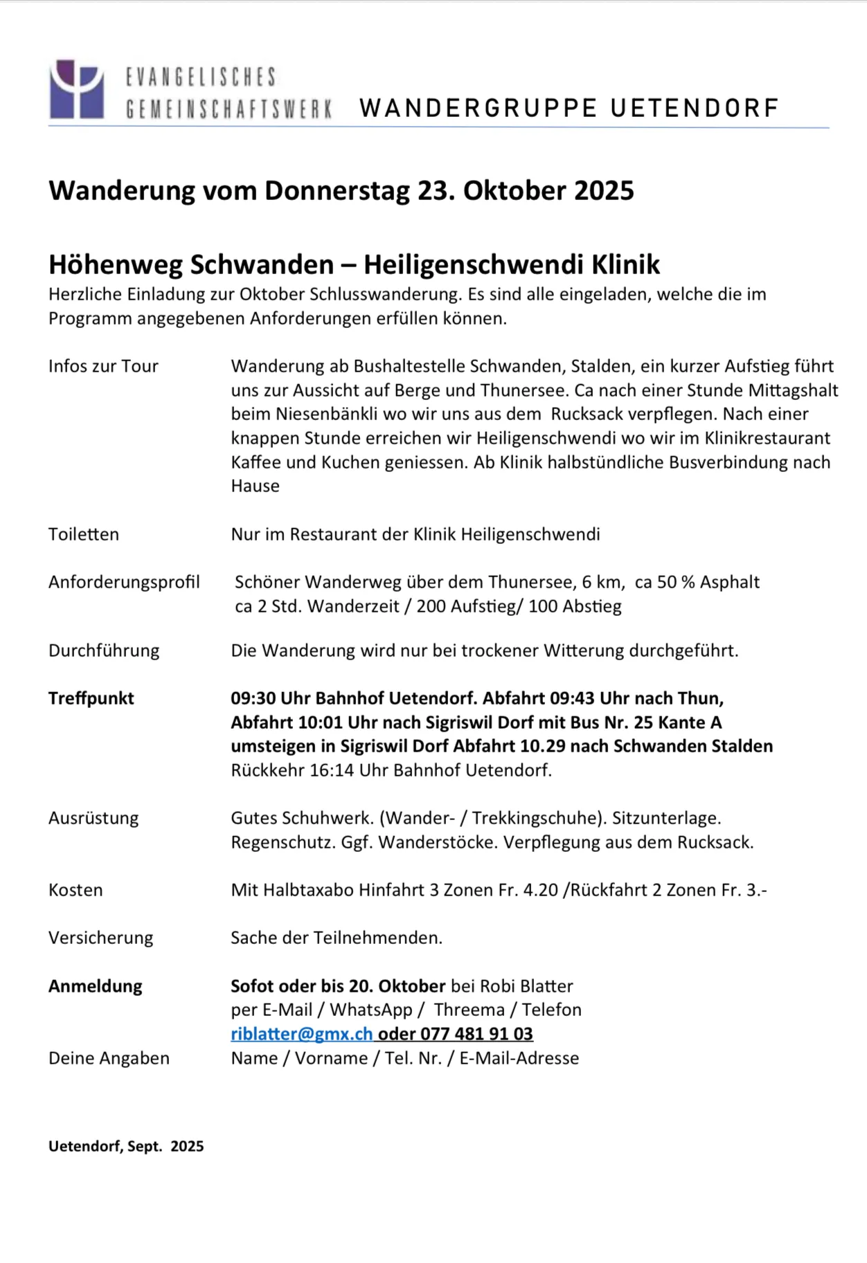 Wer mag, kann und Freude am gemeinsamen Unterwegssein hat, ist eingeladen jeden dritten Donnerstag im Monat mitzuwandern. Das Wanderziel und die Anforderung erfährst du im Wanderprogramm des jeweiligen Wanderdatums. Wir freuen uns auf dich. Wandergruppe Jahresprogramm 2025