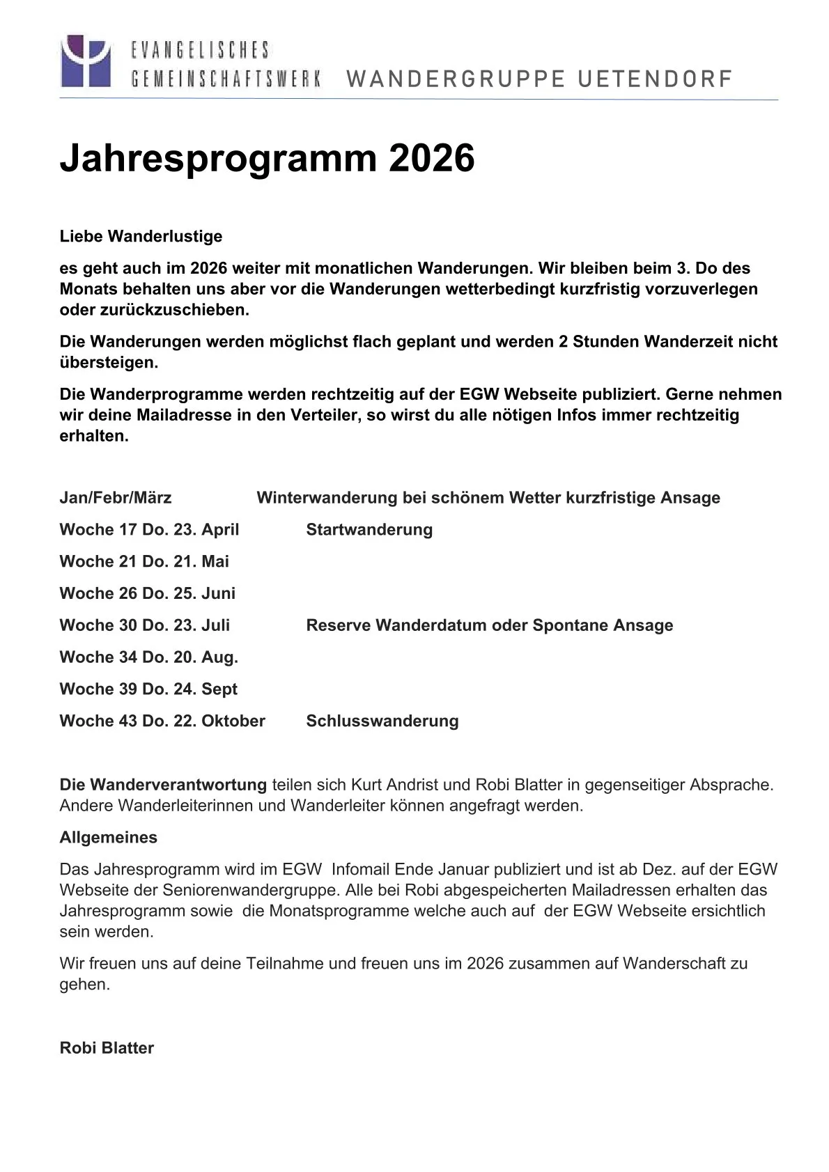 Wer mag, kann und Freude am gemeinsamen Unterwegssein hat, ist eingeladen jeden dritten Donnerstag im Monat mitzuwandern. Das Wanderziel und die Anforderung erfährst du im Wanderprogramm des jeweiligen Wanderdatums. Wir freuen uns auf dich. Wandergruppe Jahresprogramm 2026